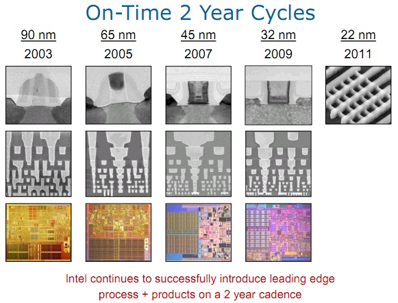 L'immagine seguente mostra la cadenza con la quale sono state prodotte le soluzioni aventi una litografia sempre inferiore, con proiezioni verso il futuro; le soluzioni a 14nm e 10nm sono previste per il 2013 e 2015.